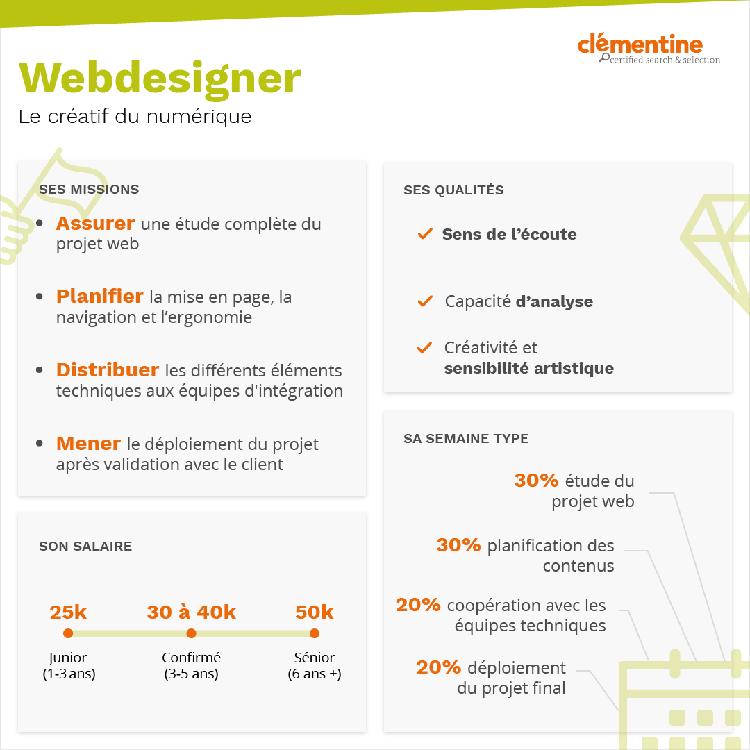 Grâce à sa riche expérience au sein du web, le web designer est une personne qui intervient dans une entreprise pour l'aider à créer son site internet. De plus, sa présence est nécessaire tout au long de sa conception et de sa mise en ligne. Il aide notamment son client à identifier ses besoins et à définir un projet ainsi que le site internet souhaité, sa présentation et son utilité pour l'entreprise.